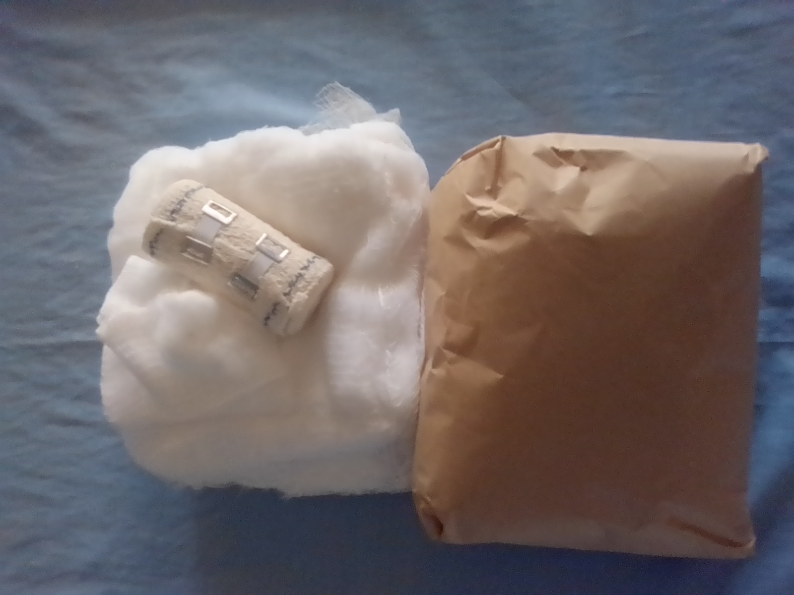 2 Moderate Size Gamgees, 10 Pieces of Guaze, 7 Cotton Wool Balls, 2 Crepe Bandage (4inches).